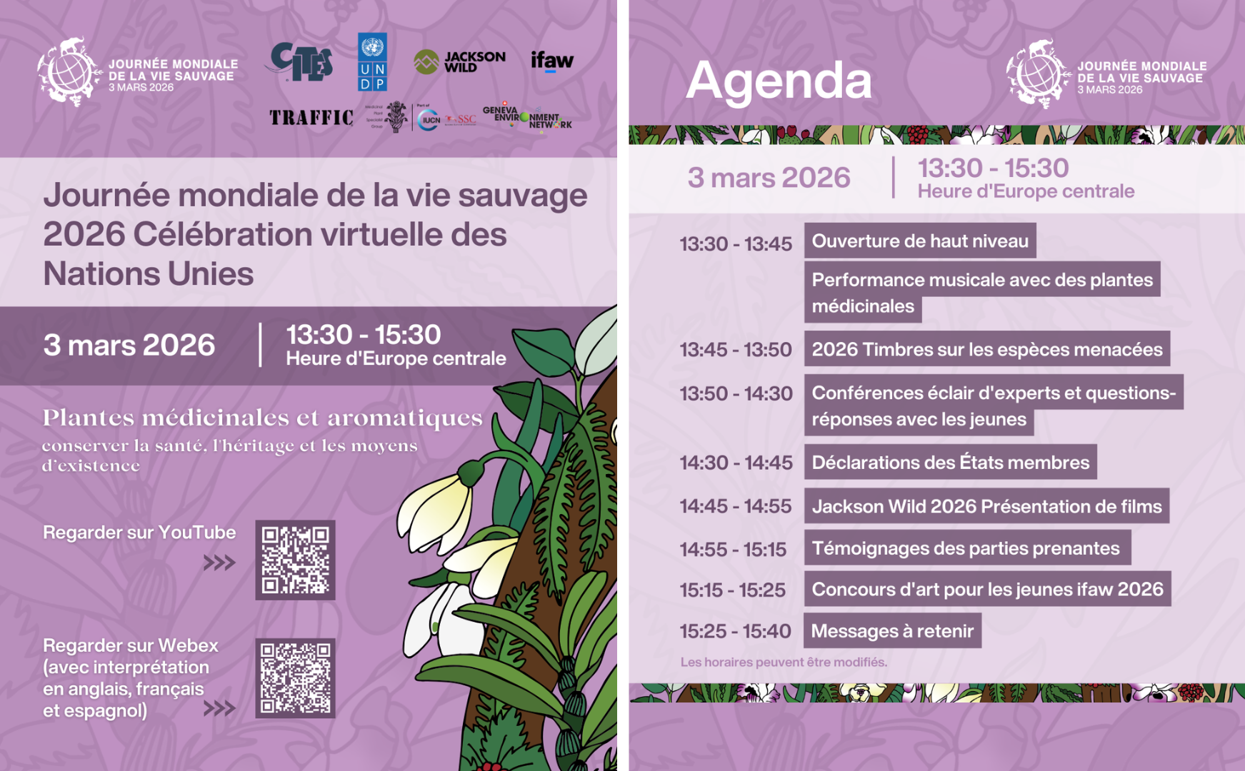 La célébration VIRTUELLE de la Journée mondiale de la vie sauvage 2026 (WWD2026) des Nations Unies, qui aura lieu le 3 mars 2026, de 13h30 à 15h30 (CET/heure d'Europe centrale), présentera des récits et des exposés sur l'utilisation durable et la conservation des plantes médicinales et aromatiques par des experts des États membres, des représentants de haut niveau d'organisations internationales, des acteurs industriels, des dirigeants de communautés locales et des membres de réseaux de jeunes.